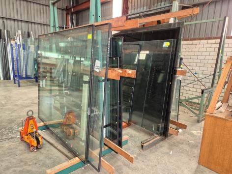 Glazier Workshop with glass processing equipment, quantity of assorted glass including double-glazed pieces, tools and motor vehicles.
